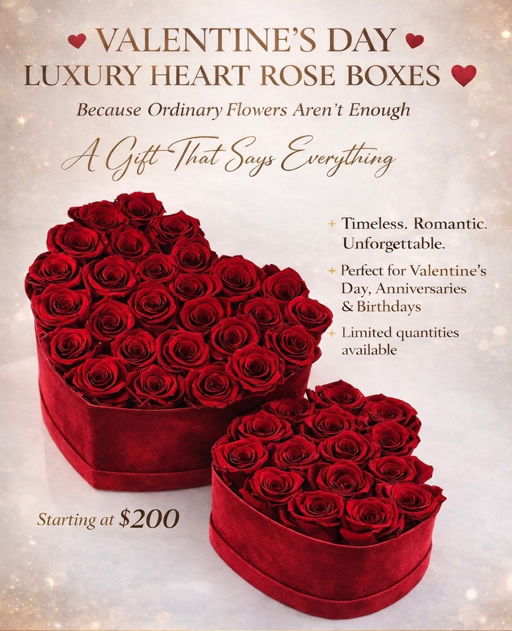 Our Limited Edition Valentine’s Heart Rose Box features premium red roses hand-arranged in a luxurious velvet heart-shaped box. Designed to impress, this timeless gift symbolizes passion, romance, and devotion.